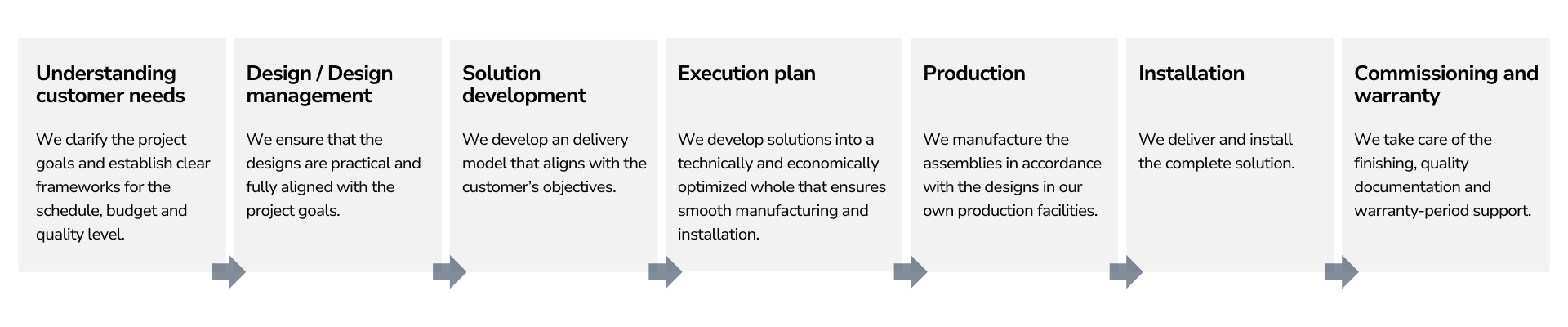 Our project model covers the full lifecycle, from initial requirement definition through fabrication, installation, commissioning, and warranty support. Structured phase management, in-house production capabilities, and experienced project leadership ensure technically and commercially optimized solutions, delivered in a controlled and systematic manner — even in highly demanding industrial environments.