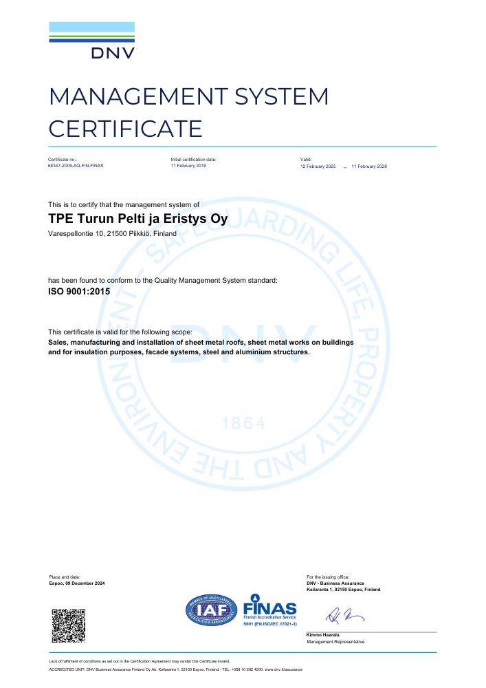 TPE holds valid ISO 9001:2015 and ISO 14001:2015 management system certificates. The certification covers all operations of our organisation: the sales, design, manufacture, and installation of metal roofing, construction and insulation sheet metal work, facade systems, as well as steel and aluminium structures.