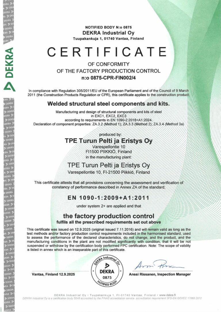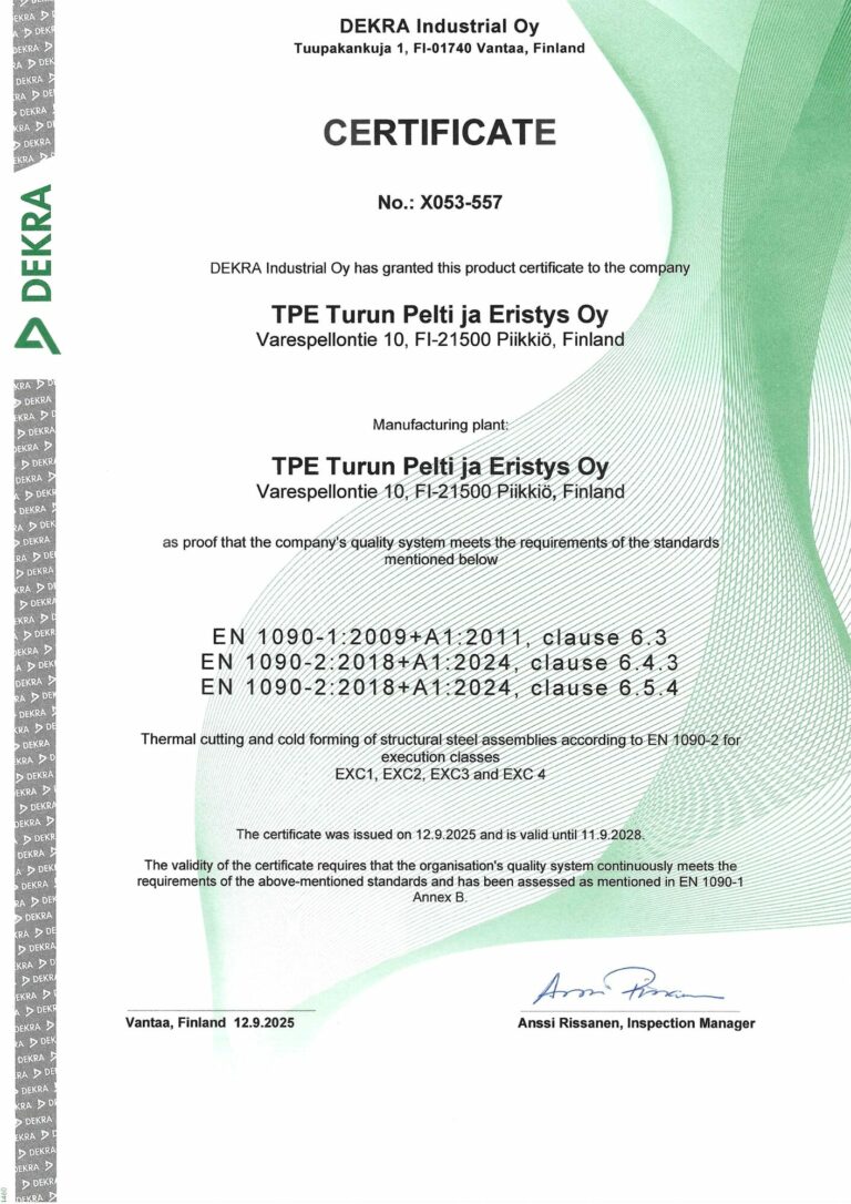 TPE has its own Factory Production Control (FPC) manual for workshop production. Our workshop production is certified in accordance with the EN 1090-1:2009+A1:2011 standard, which entitles us to CE-mark our products in execution classes EXC1–EXC3. In addition, the thermal cutting and cold forming of steel assemblies can be carried out in accordance with the EN 1090-2 standard for execution classes EXC1–EXC4.