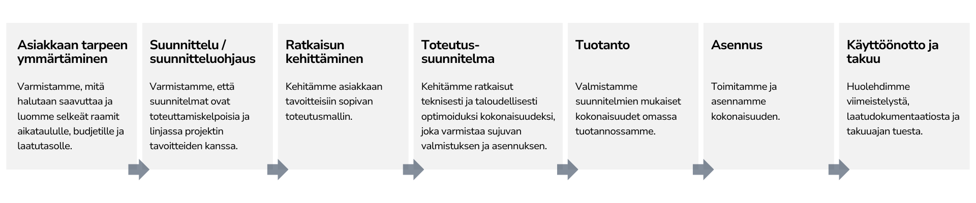 Projektimallimme kattaa koko kokonaisuuden asiakkaan tarpeen määrittelystä aina käyttöönottoon ja takuuaikaiseen tukeen asti. Selkeä vaiheistus, oma tuotanto ja kokenut projektinjohto varmistavat, että ratkaisut ovat teknisesti ja taloudellisesti optimoituja sekä toteutus etenee hallitusti – myös vaativissa teollisuuskohteissa.