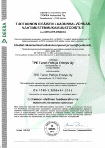 TPE:llä on voimassaoleva ISO 9001:2015 johtamisjärjestelmän sertifikaatti. Sertifiointi kattaa koko organisaatiomme toiminnan; peltikattojen, rakennus- ja eristyspellitysten, julkisivujärjestelmien sekä teräs- ja alumiinirakenteiden myynti, valmistus ja asennus.