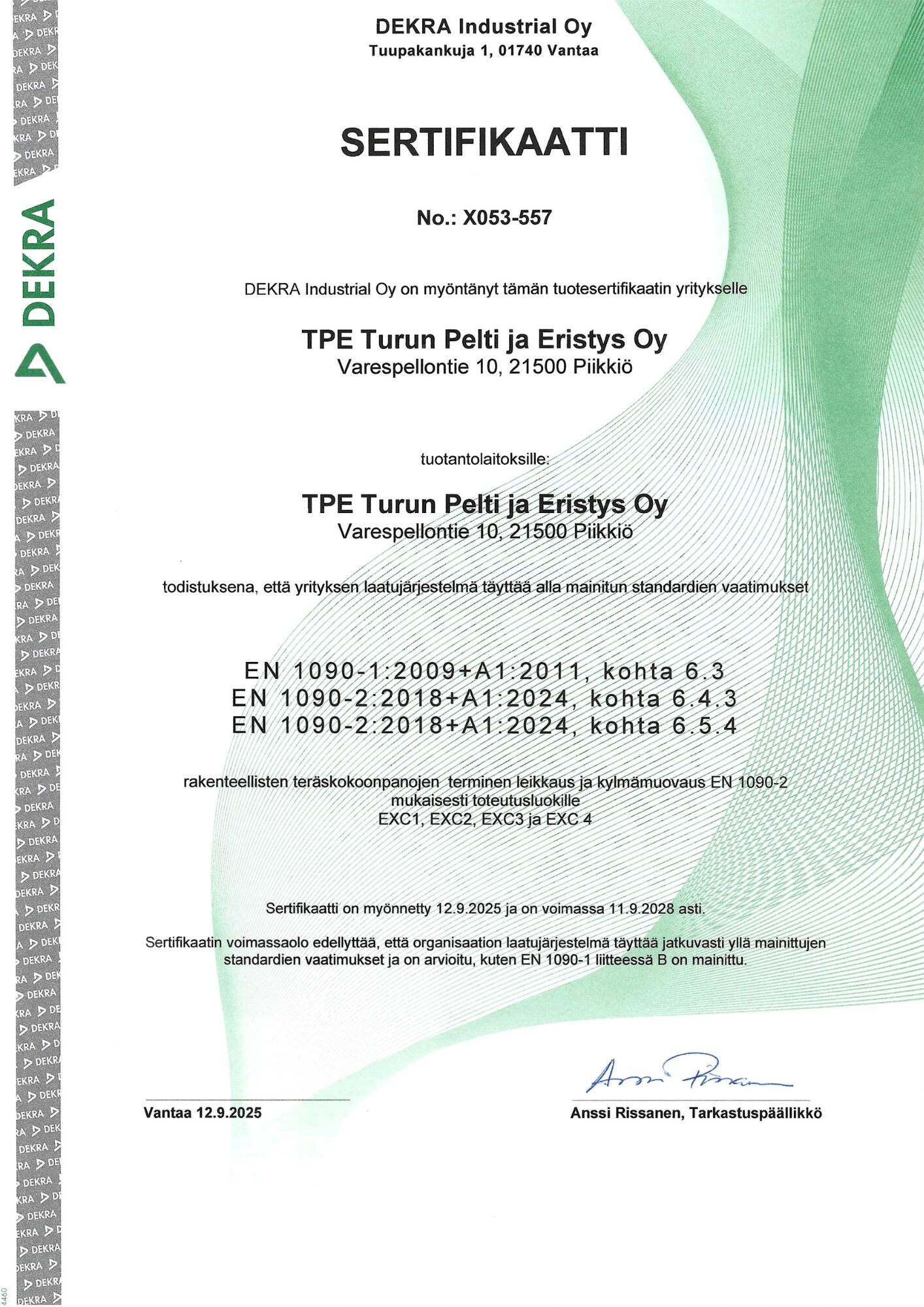 TPE:llä on voimassaoleva ISO 9001:2015 johtamisjärjestelmän sertifikaatti. Sertifiointi kattaa koko organisaatiomme toiminnan; peltikattojen, rakennus- ja eristyspellitysten, julkisivujärjestelmien sekä teräs- ja alumiinirakenteiden myynti, valmistus ja asennus.