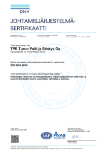 TPE:llä on voimassaoleva ISO 9001:2015 sekä ISO 14001:2015 johtamisjärjestelmän sertifikaatit. Sertifiointi kattaa koko organisaatiomme toiminnan; peltikattojen, rakennus- ja eristyspellitysten, julkisivujärjestelmien sekä teräs- ja alumiinirakenteiden myynti, suunnittelu, valmistus ja asennus.